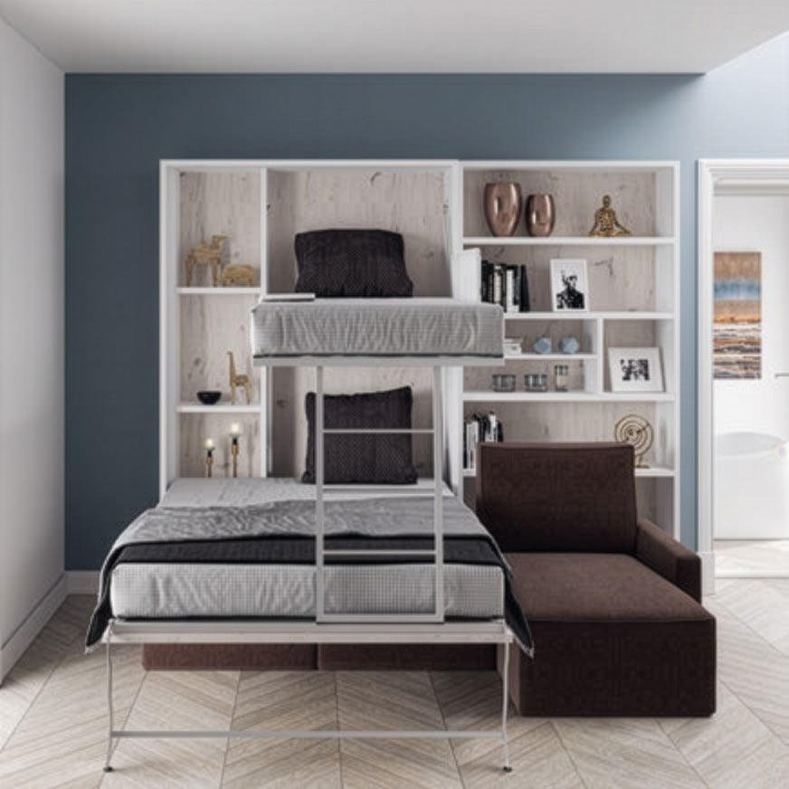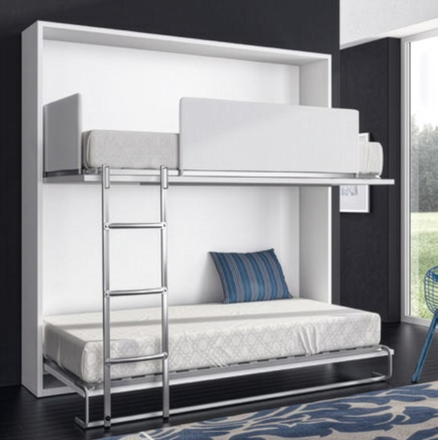 This model features a slatted base, hydraulic piston, footboard saver, and manual legs. This model does not require straps to hold the mattress. They have railings and folding ladders so there’s no need to remove them once the beds are closed. The ladder folds in front of the front railing.